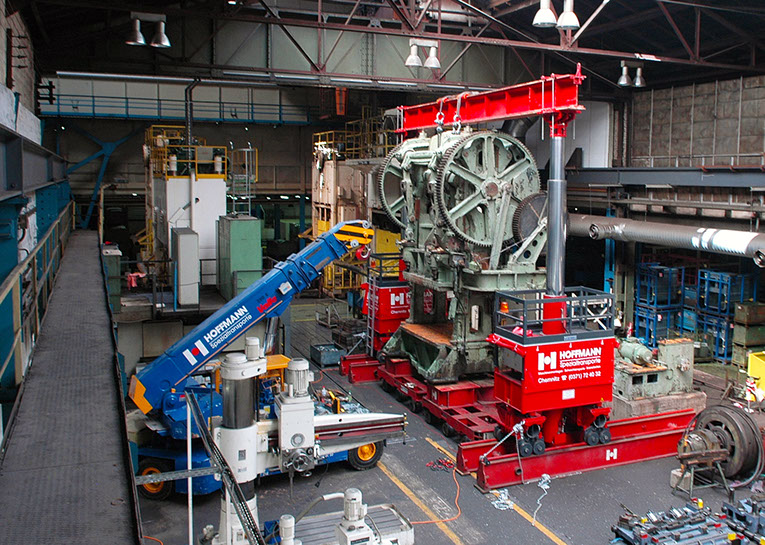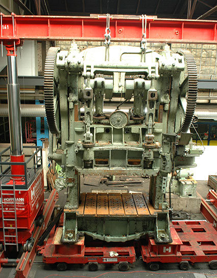 Eisenach City Council commissioned us to translocate a double-lever deep drawing press originally built by Schuler of Göppingen. This superb 90-year old machine was to be transported by the time-honoured Eisenach vehicle factory, UFE GmbH, to the Eisenach Automobile Museum “automobile welt Eisenach” for display there as an industrial heritage monument, witnessing a bygone age of automotive engineering in Eisenach. Dismantlement of the press weighing 70 t was carried out by us using a heavy-duty industrial crane assisted by hydraulic hoisting gear, a process carried out while production was in progress at UFE. Under highly restricted space conditions, the press was hoisted from its foundations and transported across narrow lanes. On account of its dimensions (approx. 6 x 3 x 7 m) the giant press had to be transferred to a heavy-duty hydraulic trailer and hauled out of the building. Afterwards it was transported to its future site in front of the museum where it was erected employing two 70 t and 160 t truck-mounted cranes.
