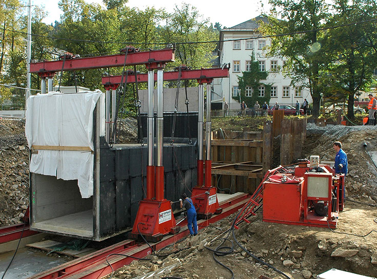 Während des Baus einer barrierefreien Bus- und Bahn-Verknüpfungsstelle im Zentrum des Kurortes Thermalbad Wiesenbad musste ein schwerer Tunnelblock eingebaut werden. Aufgrund der schwierigen Bodenverhältnisse am Baustandort wäre das Einheben mittels Großkranen zu teuer gewesen und so erhielten wir den Auftrag, dieses Bauteil mittels Hubportal zum Standort zu transportieren.